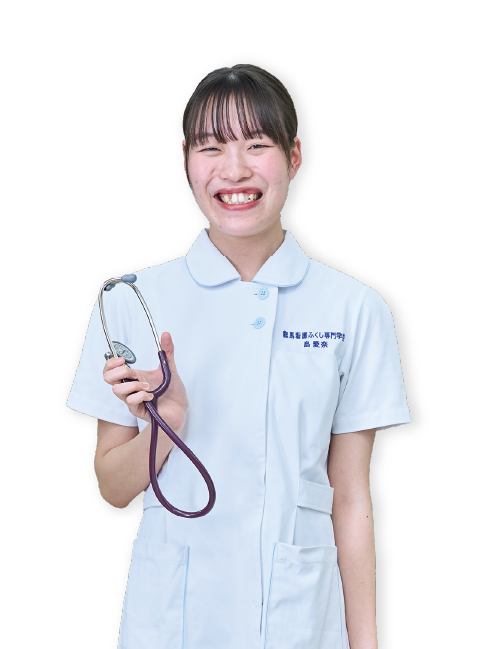 高知小津高校出身祖父が入院した際、家族に寄り添ってくれた看護師さんの姿に感動し、私もそんな素敵な看護師になりたいと思い入学しました。クラスメイトはみんな仲が良く、国家試験対策も専門の先生がサポートしてくれて、本当に心強かったです。初めての職場に一日も早く慣れるためにも積極的にコミュニケーションを取り、認定看護師を目指して頑張ります。