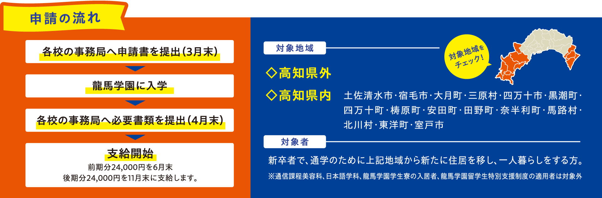 遠方から龍馬学園に入学する方を対象とした、「一人暮らしサポート制度」がスタートします。