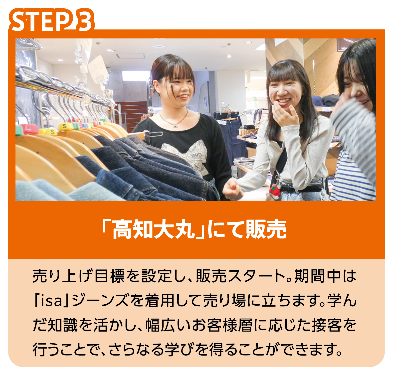 高知県幡多郡黒潮町で、大手国内ジーンズメーカーのOEMを手掛けている「じぃんず工房大方」の自社ブランド「isa」と連携して、新商品の企画・商品化から実際の販売まで実施。高知大丸に期間限定ショップをオープンして、学生たちで販売します
