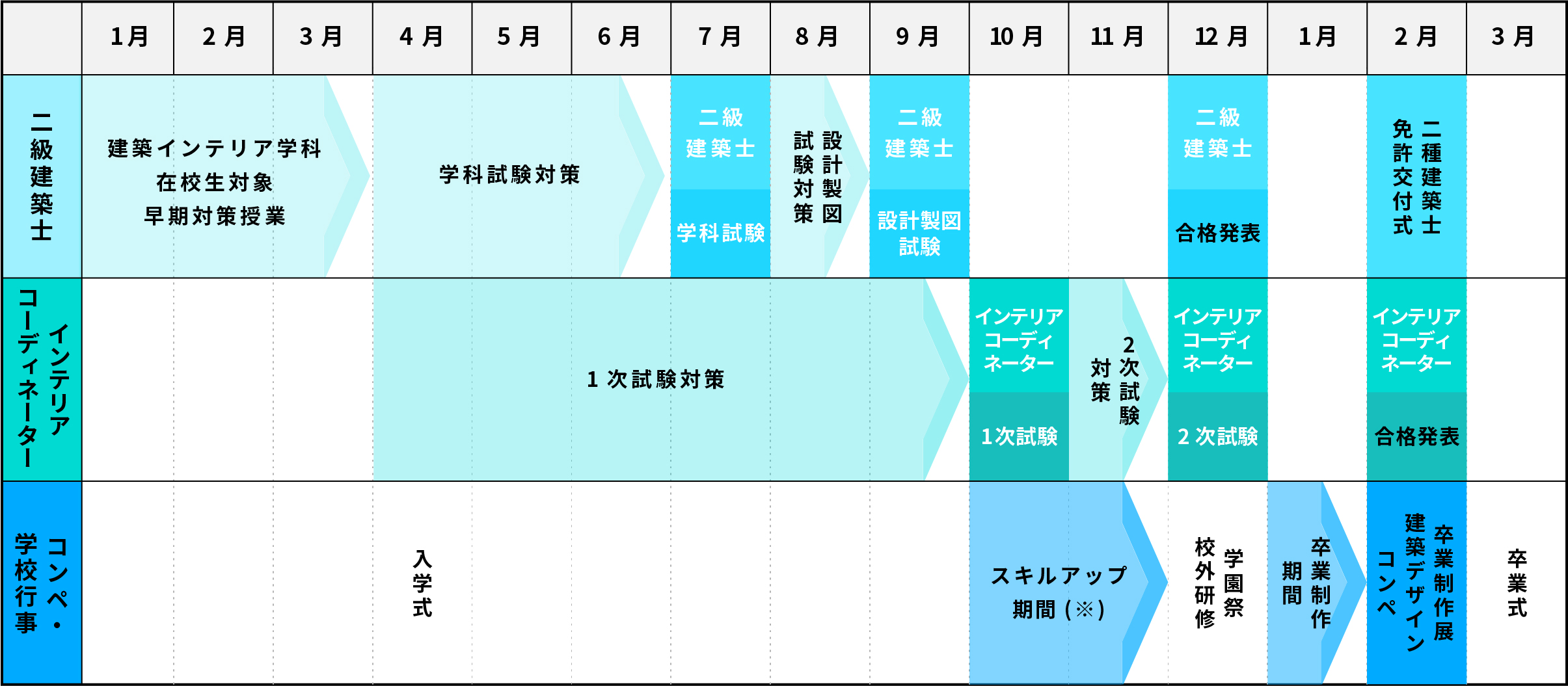 ※スキルアップ期間:自分自身の課題に向き合い、就職先から求められる知識や技術を身につけて、即戦力になれるようしっかりと準備をしていきます。