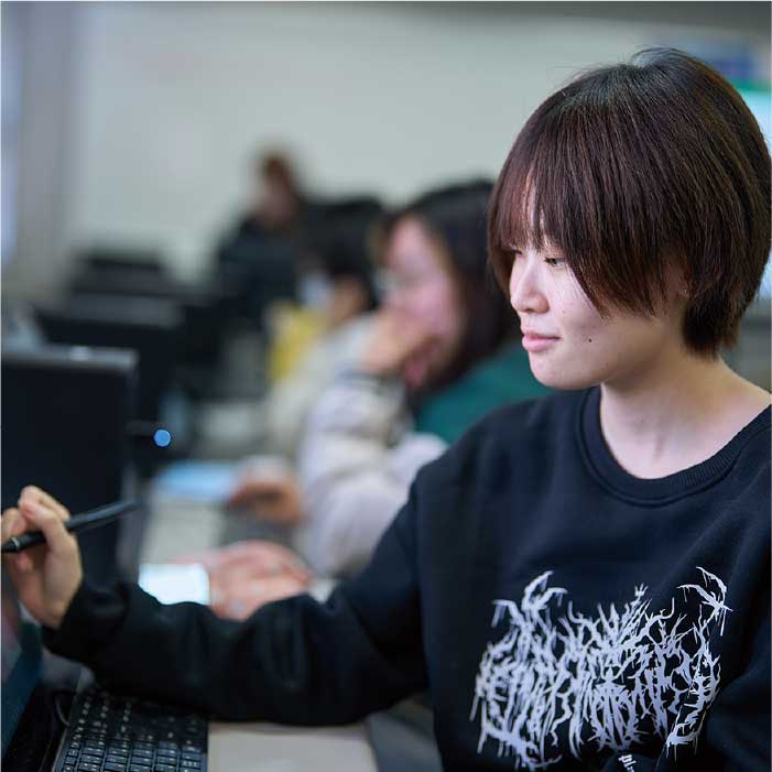 アナログの授業が好きで、特にマンガベーシックやマンガ演習、ドローイングの授業を楽しんでいます。授業を通じて技術が身につき、デジタルスキルも向上しました。将来は日本でマンガやアニメーションに携わる仕事に就くことが目標です。